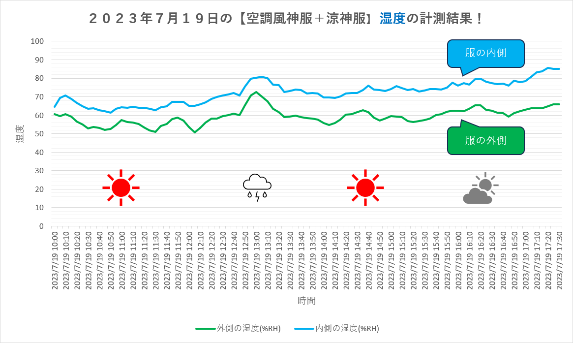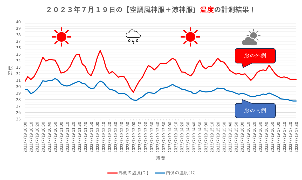 実験結果から、梅雨明け直前のじめじめした気候でも、涼神服の気化熱効果は発揮されて服の内部は温度が下がっていることがわかりました!
